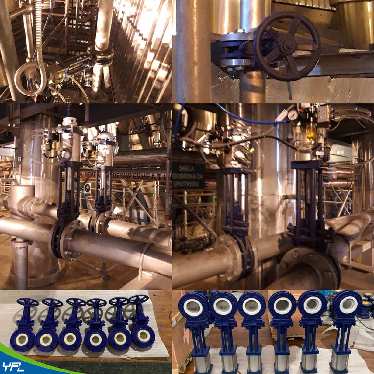 YFL pneumatic ceramic knife gate valves and manual ceramic knife gate valves have been installed in a new line limestone piping during client's last overhaul in May.